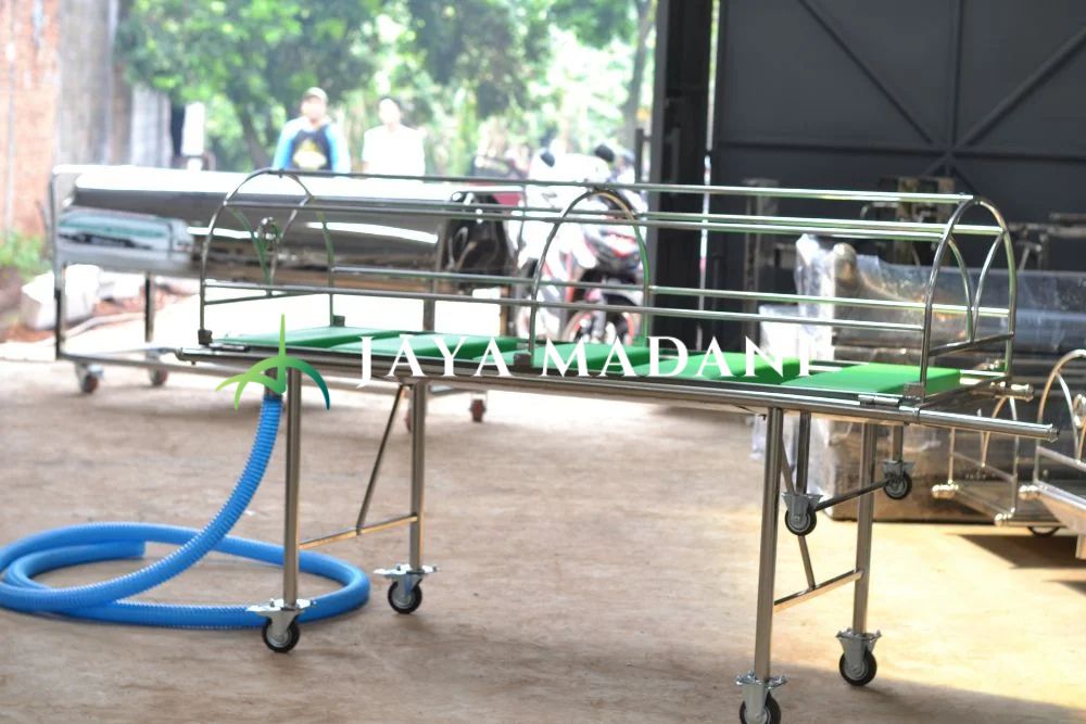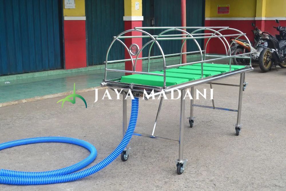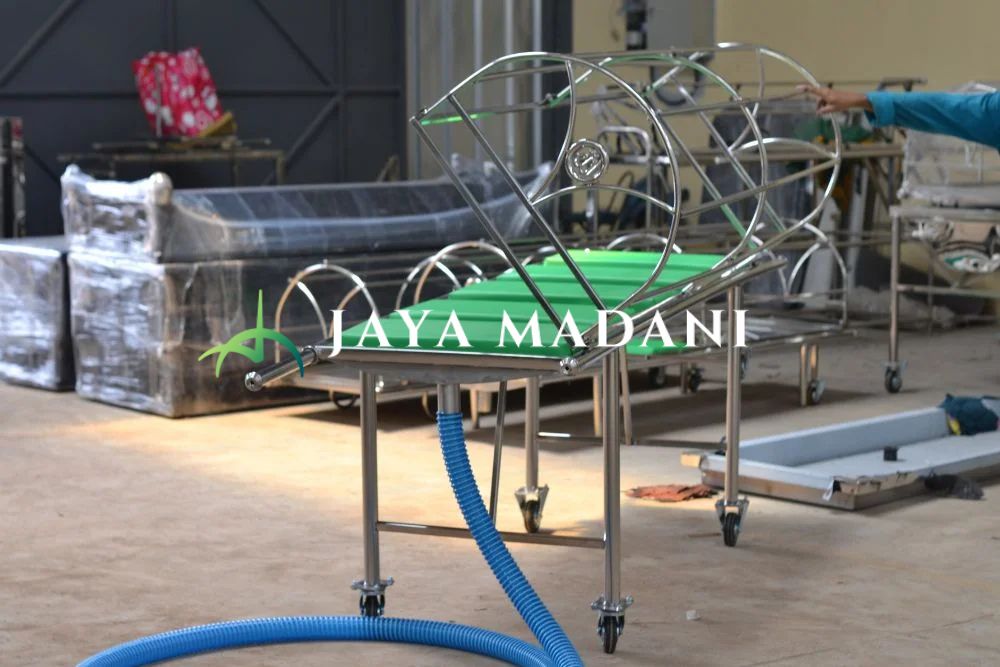 Keranda ini memiliki fungsi ganda sebagai media untuk memandikan jenazah, dengan tambahan bantalan kulit dan selang spiral pembuangan. Cocok untuk rumah sakit atau pusat layanan jenazah yang memerlukan fleksibilitas.