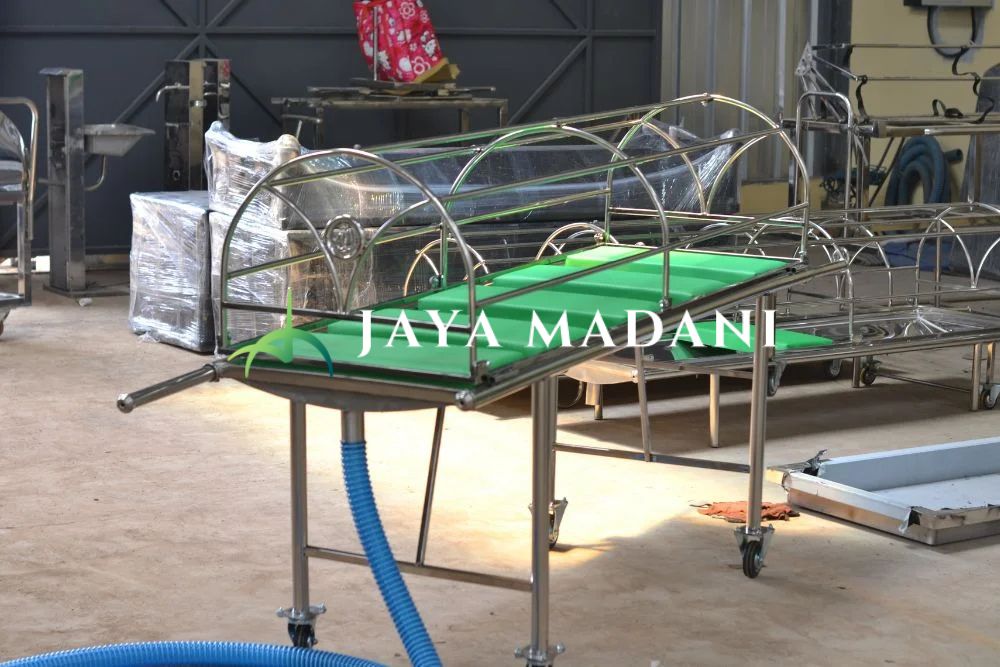 Keranda ini memiliki fungsi ganda sebagai media untuk memandikan jenazah, dengan tambahan bantalan kulit dan selang spiral pembuangan. Cocok untuk rumah sakit atau pusat layanan jenazah yang memerlukan fleksibilitas.