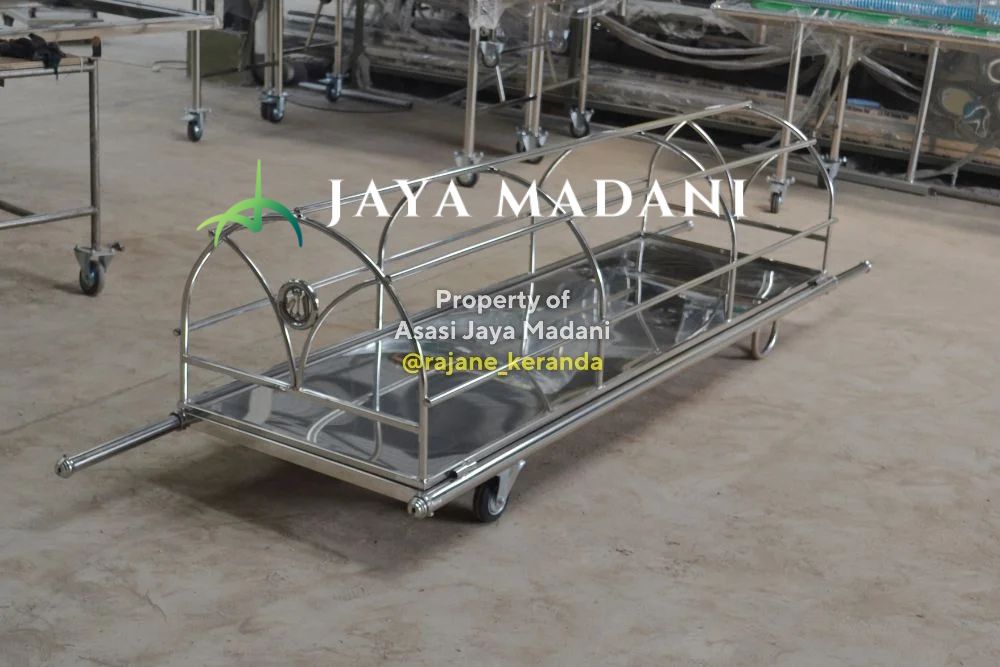 Keranda dengan model dan ukuran standar Indonesia, ideal untuk penggunaan umum di masjid atau musholla. Dengan roda karet 4 inch dan rem, tipe keranda ini mudah dipindahkan dan cocok untuk penggunaan di mobil jenazah.